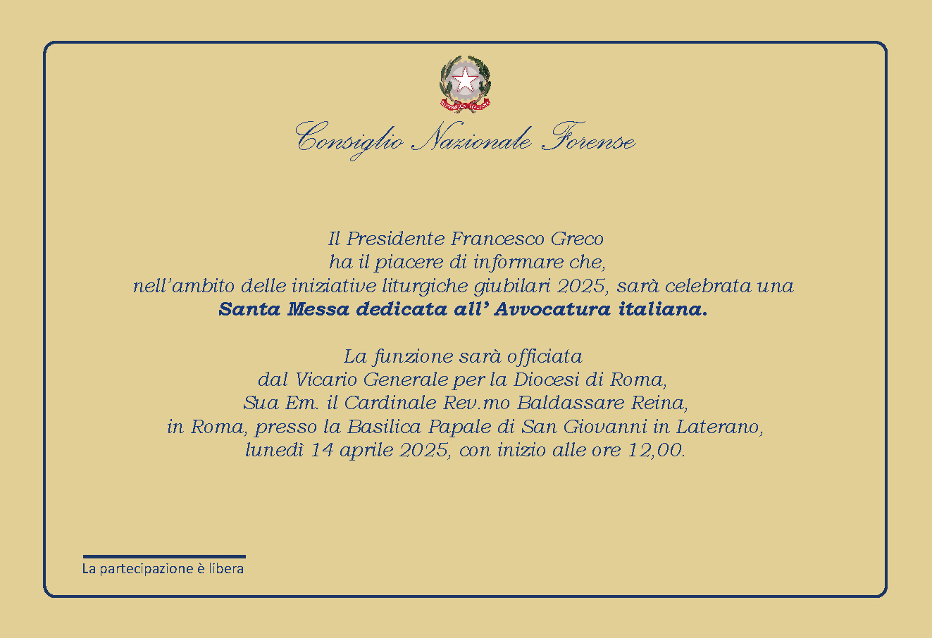 Si comunica che il Consiglio Nazionale Forense, nell’ambito delle attività liturgiche inserite nell’anno giubilare 2025, d’intesa e con la disponibilità di Sua Eminenza il Cardinale Rev.mo Baldassare Reina, Vicario Generale per la Diocesi di Roma e Arciprete della Basilica Papale di San Giovanni in Laterano, ha organizzato la celebrazione di una Santa Messa dedicata all’Avvocatura italiana ed ai familiari e collaboratori.